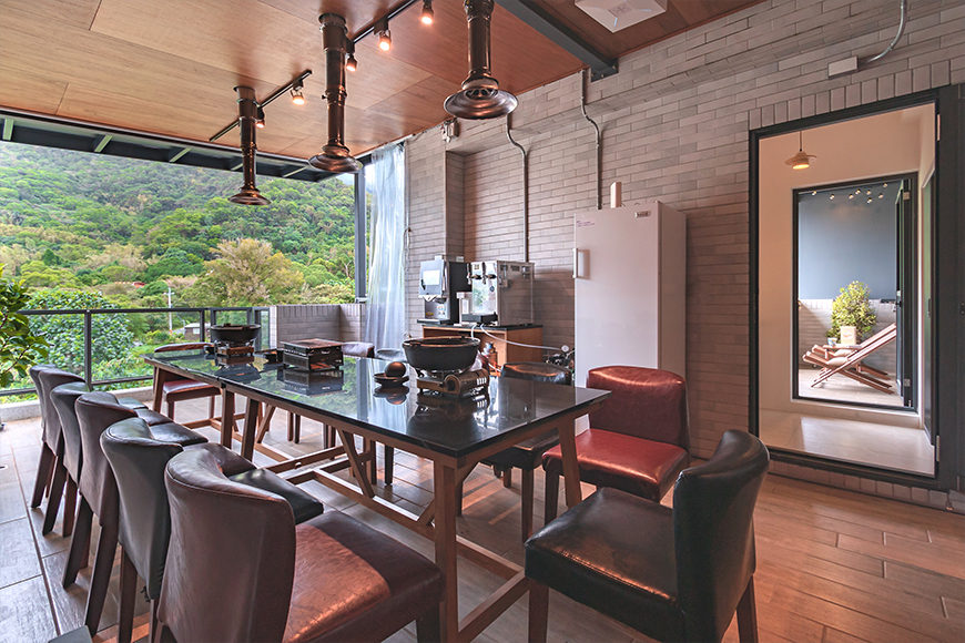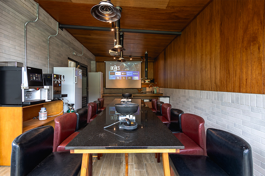 那裡民宿,有著大餐桌,備有室內烤肉用具,咖啡機,在大家一同享用美食同時,還有投影布幕可以追劇、看運動賽事或是電影節目