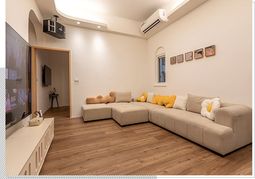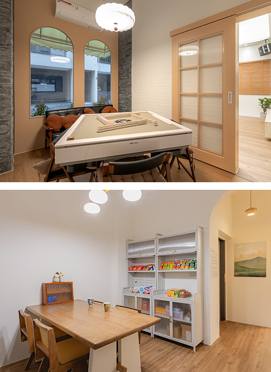 那裡民宿,有著大餐桌,備有室內烤肉用具,咖啡機,在大家一同享用美食同時,還有投影布幕可以追劇、看運動賽事或是電影節目
